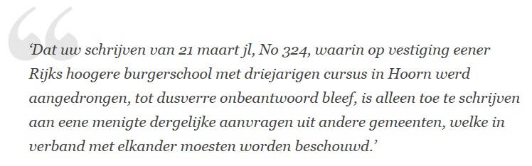 Die oneliner tekende ik in mei 2001 op uit de mond van de toenmalige directeur van de Centrale Directie van het Atlascollege. In die onderwijskoepel was onder meer de opvolger ondergebracht van de vierjarige hbs van Hoorn, die in 1908 was overgegaan naar het Rijk. Bij het begin van de onderwijshervorming van 1863 hadden vrijwel alle kleinere gemeenten om verschillende redenen een rijks-hbs geambieerd. Een rijks-hbs was een gewild artikel. Slechts enkele kregen hun zin.