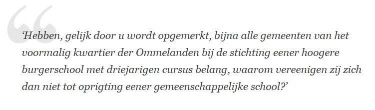 die tevens burgemeester was van het nabijgelegen Usquert, leek zich er al bij neer te leggen en stelde voor een plan op te stellen voor zo’n regioschool. Maar wethouder Reinders wilde nog niet opgeven. Hij stelde voor om andermaal een verzoek tot de minister te richten en met de verzending daarvan te wachten tot het begin van de vergaderingen van de Kamer na het kerstreces. Westerhoff en Reinders konden dan nogmaals bij de minister het verzoek van de gemeenteraad persoonlijk ondersteunen. Ook hier dus een lobby onder liberale geestverwanten.